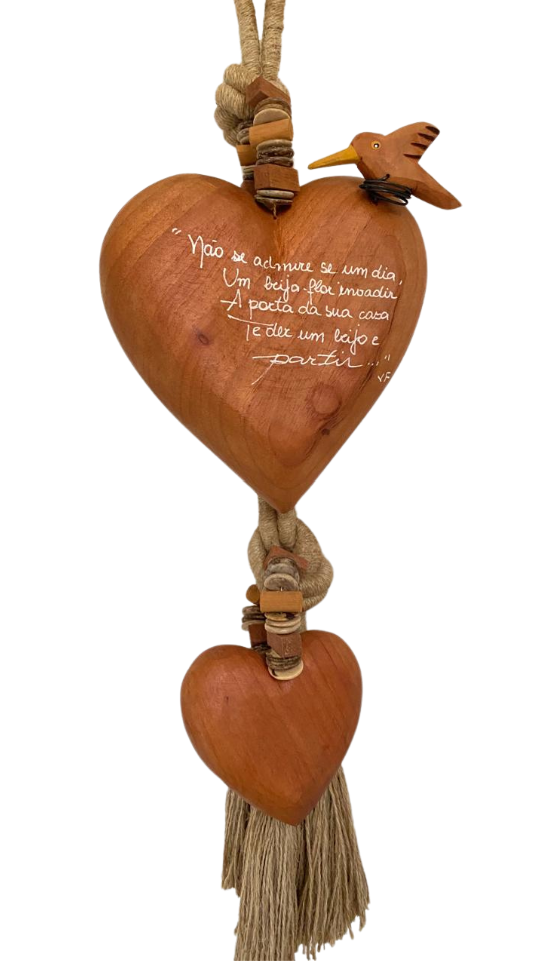 O destaque da peça é um coração maior esculpido em madeira, trazendo consigo um beija-flor também feito em madeira, em uma pose graciosa. O detalhe especial fica por conta da inscrição manual no coração maior, adicionando um toque personalizado e artesanal.