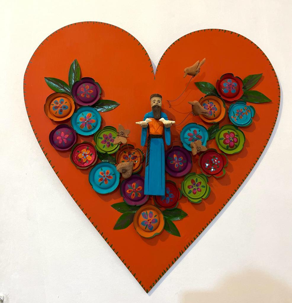 Coração em MDF medindo 60x60 com São Francisco esculpido na madeira medindo 23 cm e latas de reciclagem na ornamentação