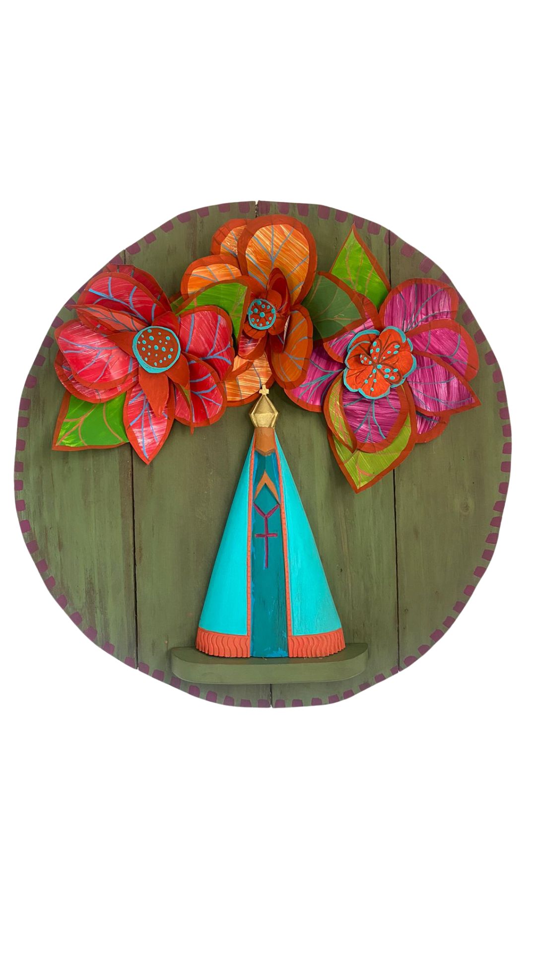 Adicione um toque de elegância e sustentabilidade à sua decoração com a Mandala em Madeira Maciça. Medindo 60x60 cm, esta peça única combina a robustez da madeira maciça com a delicadeza das flores feitas de lata reciclada, pintadas à mão.