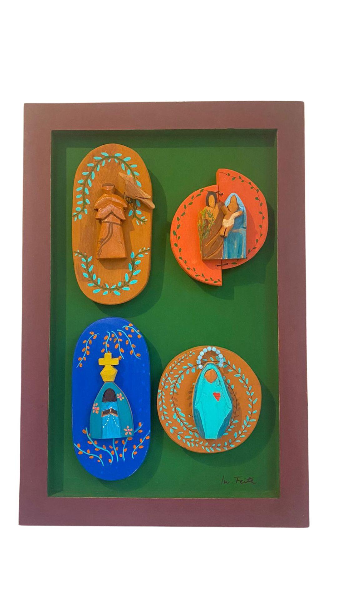 Descrição do Produto: Moldura em Madeira Maciça Pintada à Mão com 4 Santinhos Decorativos