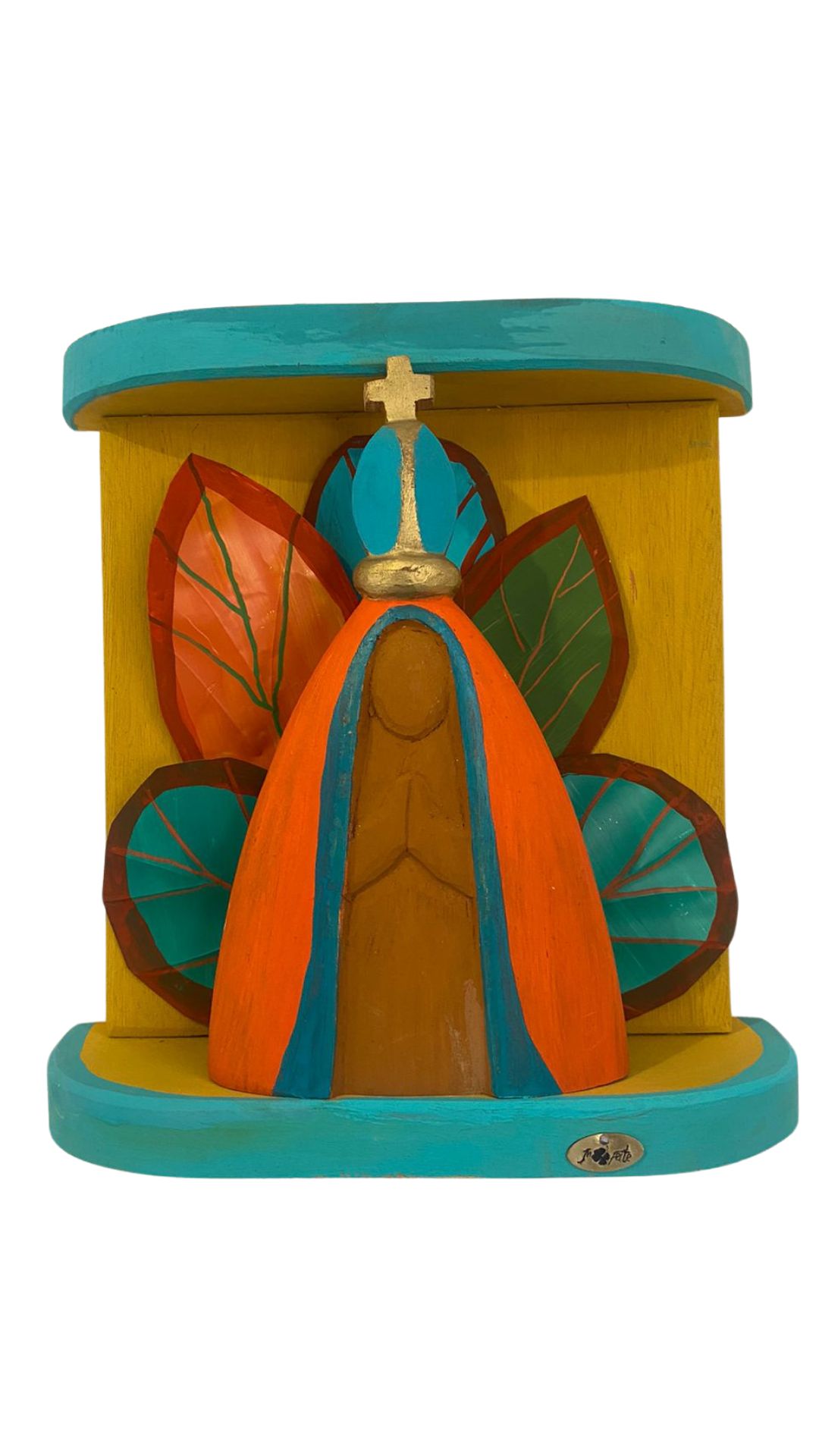 Adorne seu espaço com o Oratório Aparecida Collor, uma peça única esculpida em madeira maciça e pintada à mão. Medindo 25x25 cm, este oratório captura a essência e a majestade de Nossa Senhora Aparecida com detalhes precisos e uma pintura vibrante.